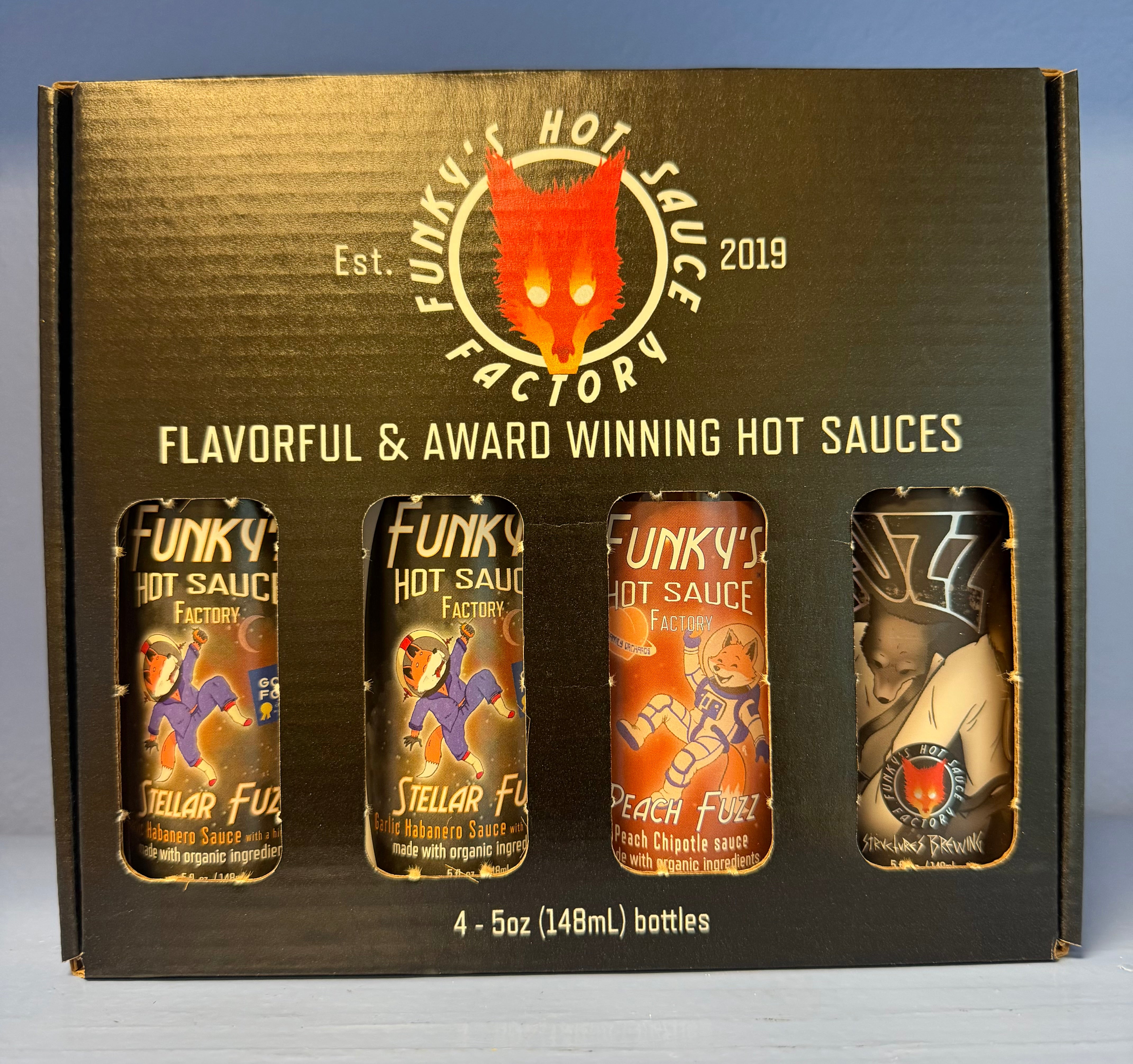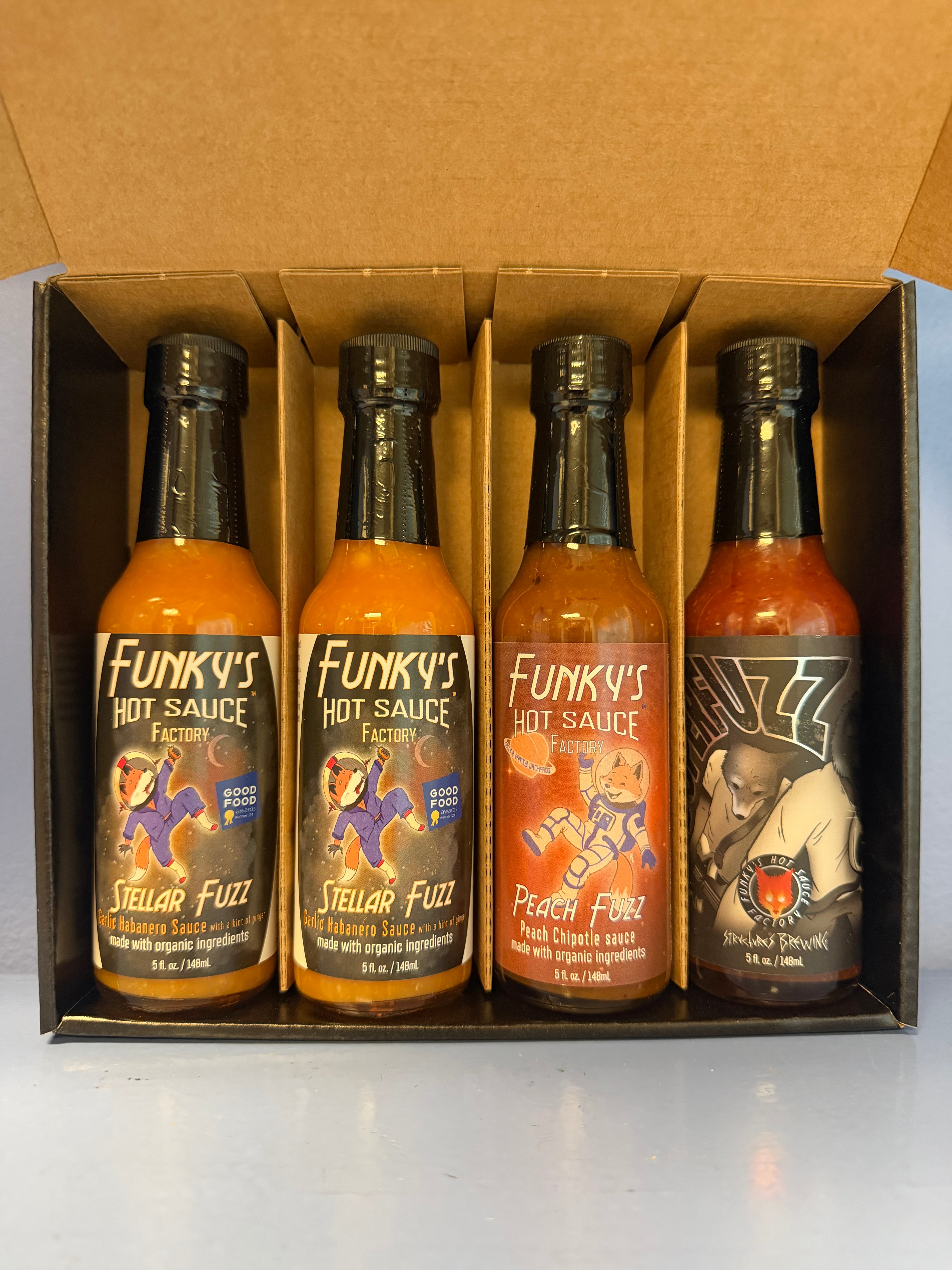 This 4-pack includes all 3 of our Fuzz sauces and an extra bottle of our award winning Hot Ones sauce, Stellar Fuzz!