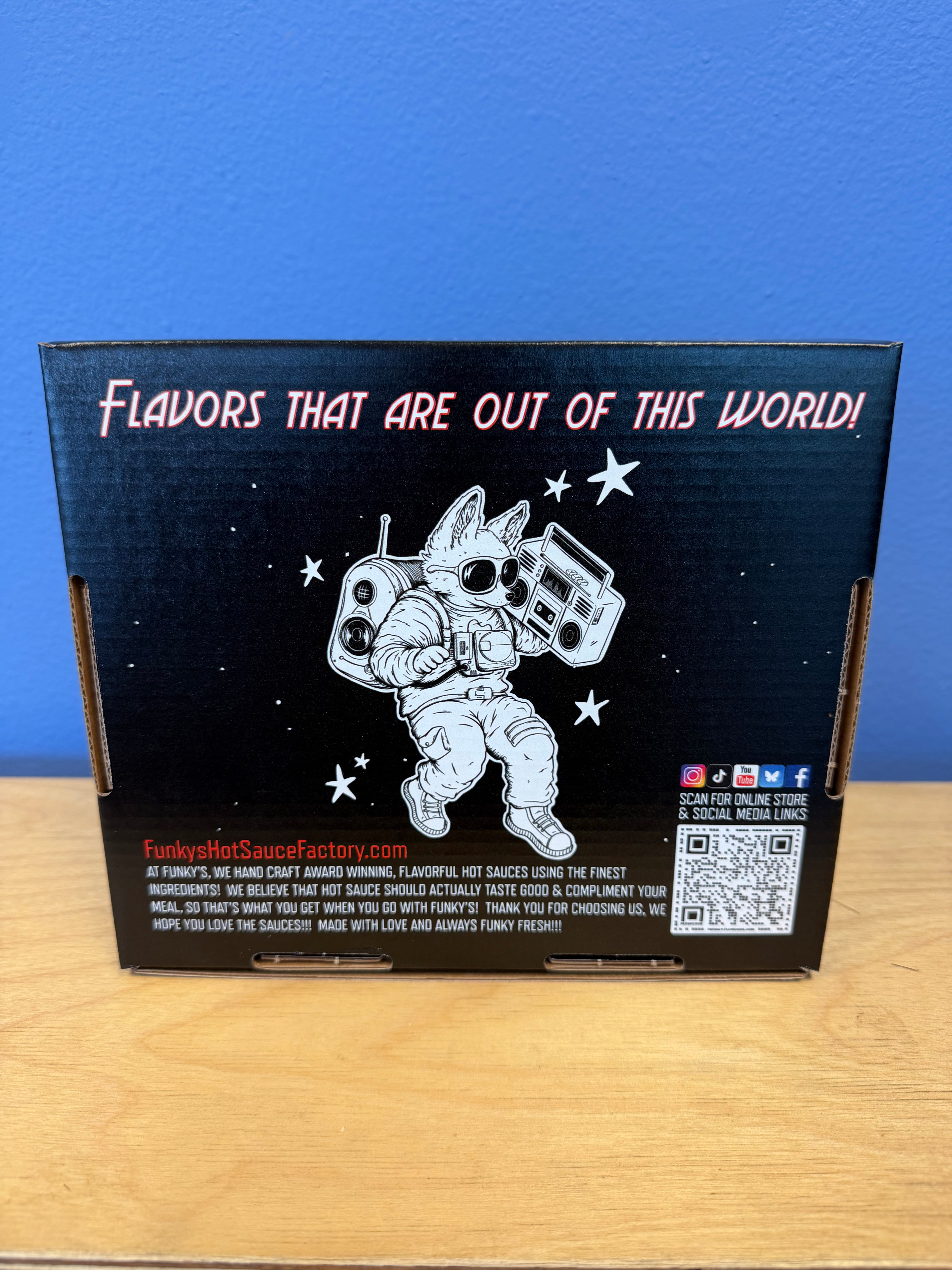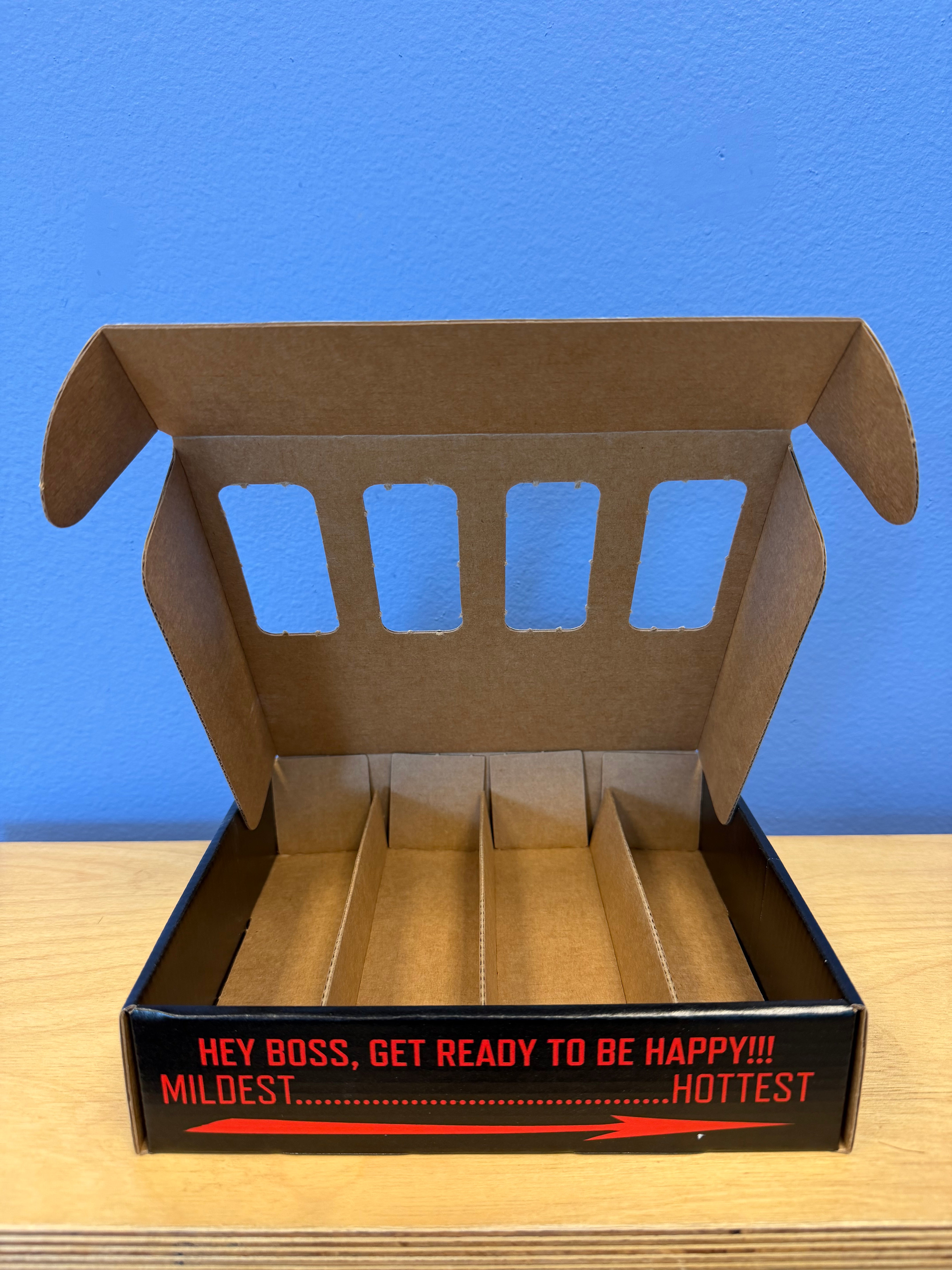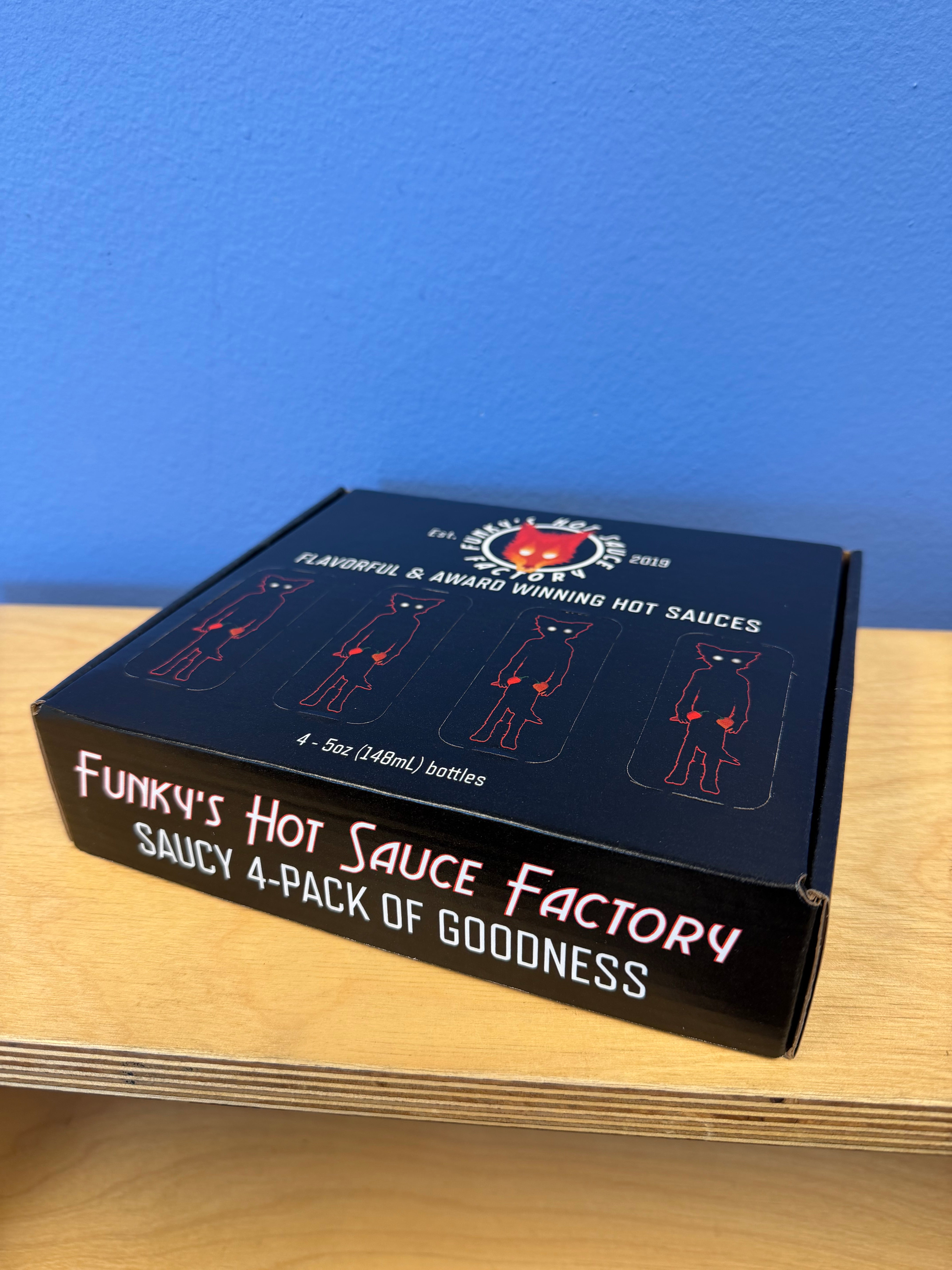 Funky’s 4-pack gift box. Fits up to 4 bottles of Funky’s Hot Sauces. This is the box only, no sauce included.