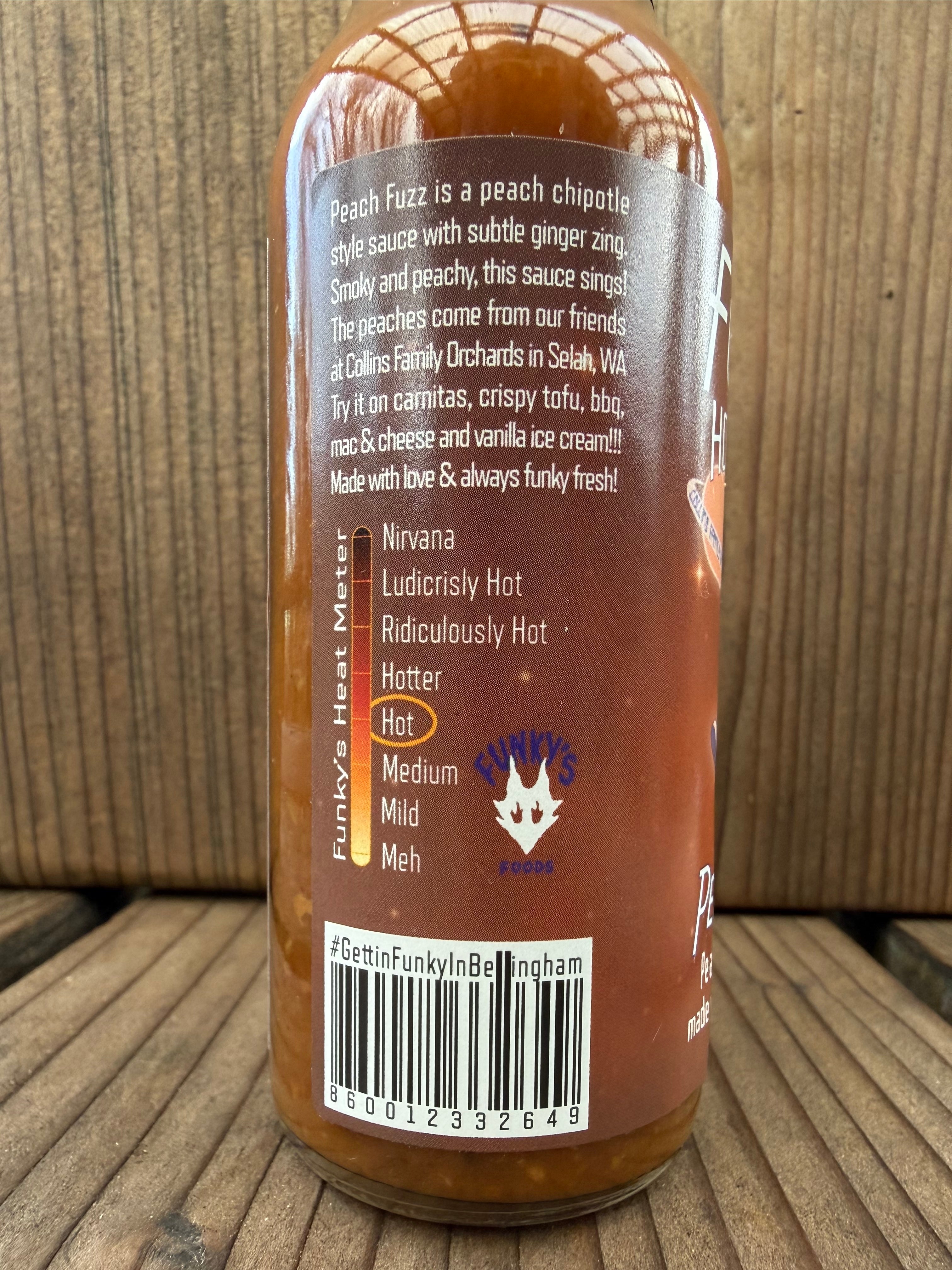 Peach Fuzz is a peach chipotle style sauce with subtle ginger zing.  Smoky and peachy, this sauce sings!  The peaches come from our friends at Collins Family Orchards in Selah, WA.  Try it on carnitas, crispy tofu, bbq, mac & cheese and vanilla ice cream!!!