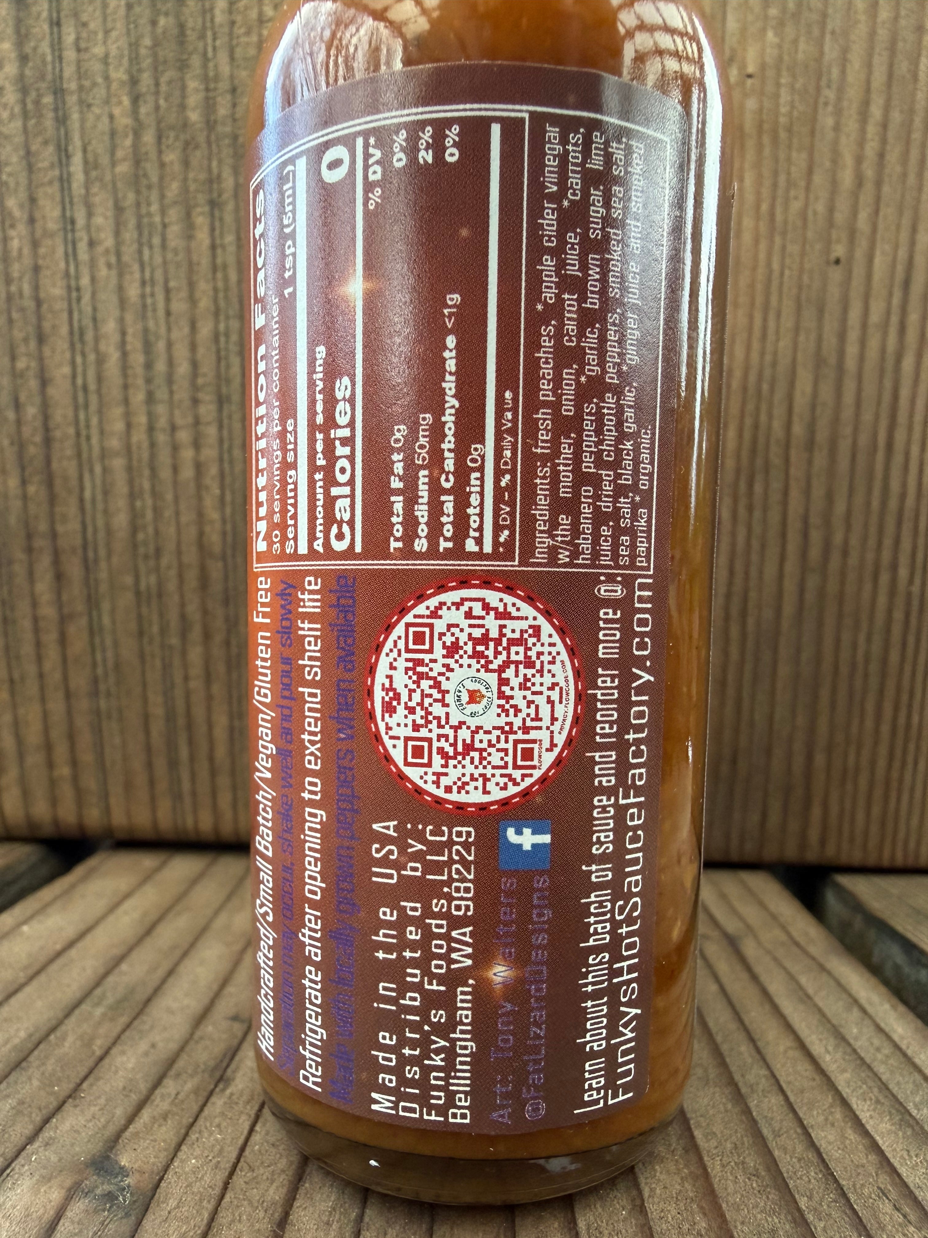 Ingredients: Fresh peaches, *apple cider vinegar w/the mother, onion, carrot juice, *carrots, habanero peppers, *garlic, brown sugar, lime juice, dried chipotle peppers, smoked sea salt, sea salt, black garlic, *ginger juice and smoked paprika. *organic